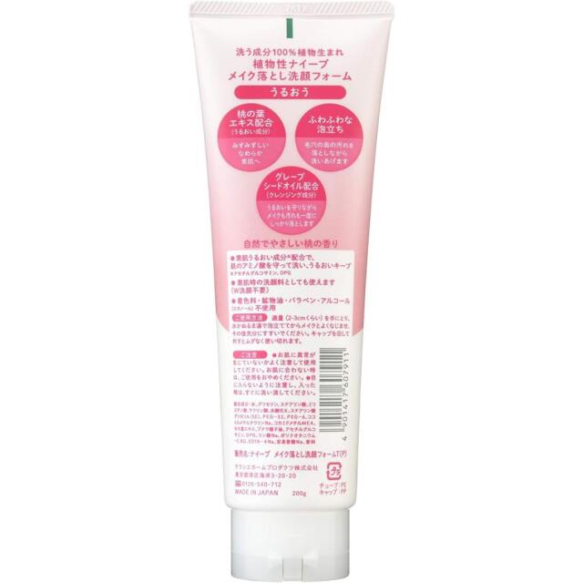 水、グリセリン、ステアリン酸、ミリスチン酸、ラウリン酸、水酸化K、ステアリン酸グリセリル(SE)、ラウラミドDEA、PEG-32、 PEG-6、ココイルメチルタウリンNa、モモ葉エキス、サピンヅストリホリアツス果実エキス、オリーブ果実油、アルテア根エキス、マカデミア種 子油、アセチルグルコサミン、グリコシルトレハロース、加水分解水添デンプン、リン酸Na、ポリクオタニウム-7、BG、EDTA-4Na、安息 香酸Na、香料