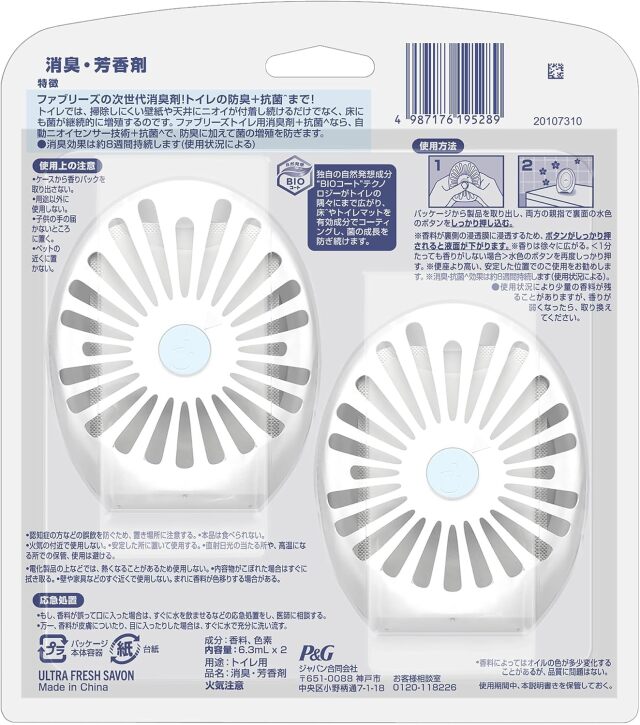 ファブリーズ 消臭芳香剤 消臭+抗菌 トイレ用 ウルトラ・フレッシュ・シャボン 6.3mLx2個